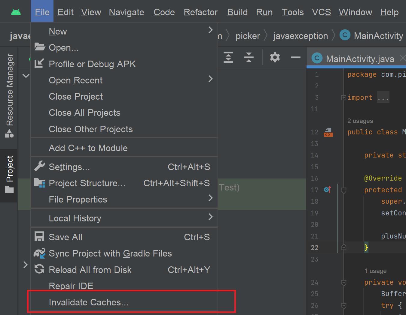 아래 스크린샷처럼 invalid caches를 눌러서 cache를 삭제하면 해결이 됩니다.