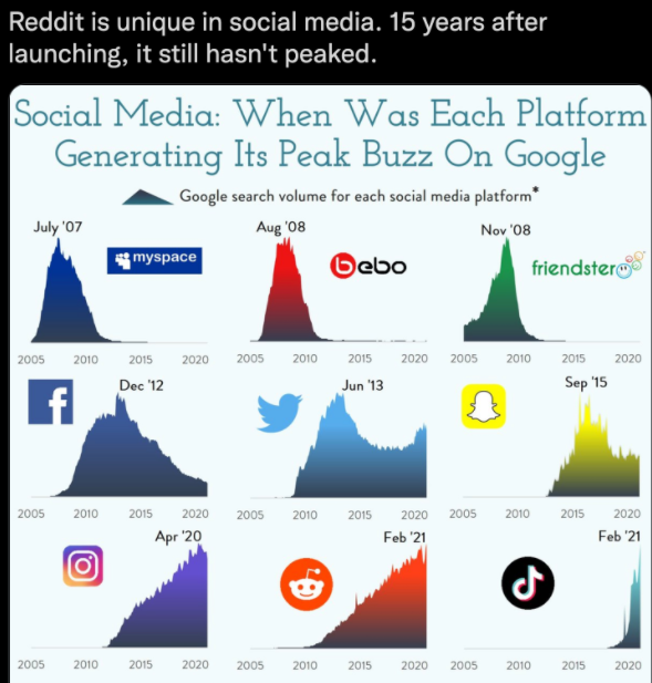 Paul Graham은 이 이미지가 Reddit이 소셜 미디어 사이트로서 "아직 정점에 이르지 못했다"는 의미라고 생각합니다. 이것이 실제로 의미하는 바는 Reddit을 검색 엔진으로 사용하는 사람들의 수가 증가하고 있다는 것입니다.