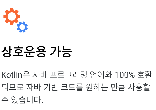 자바와의 상호 운용성. 모든 코드를 Kotlin으로 마이그레이션 하지 않고도 애플리케이션에서 Java 프로그래밍 언어와 함께 Kotlin을 사용할 수 있습니다.
