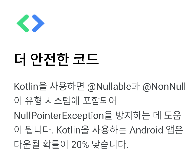코드 안전. 더 적은 코드와 더 나은 가독성은 더 적은 오류로 이어집니다. Kotlin 컴파일러는 이러한 나머지 오류를 감지하여 코드를 안전하게 만듭니다.