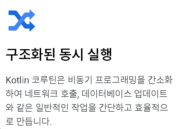 자바와의 상호 운용성. 모든 코드를 Kotlin으로 마이그레이션 하지 않고도 애플리케이션에서 Java 프로그래밍 언어와 함께 Kotlin을 사용할 수 있습니다.