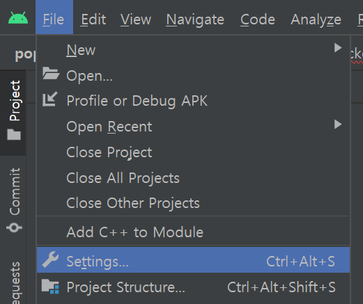 -. "File -> Settings" 메뉴를 선택하여 Settings 창을 엽니다.