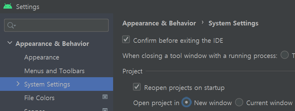 "Appearance & Behavior -> System Settings"를 선택합니다.
