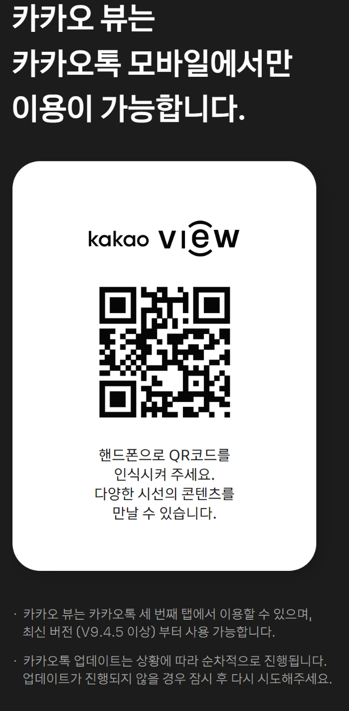 카카오 뷰를 사용해보고 싶은 분은 카카오톡에서 가운데 버튼을 누르거나 아래 QR코드를 인식하면 됩니다.