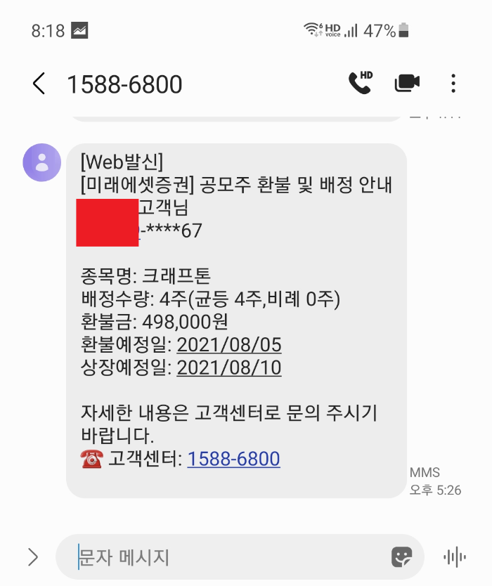 이전 게시물에서 언급했듯이 저도 청약을 진행하였는데, 미래에셋에서 결과가 왔네요.