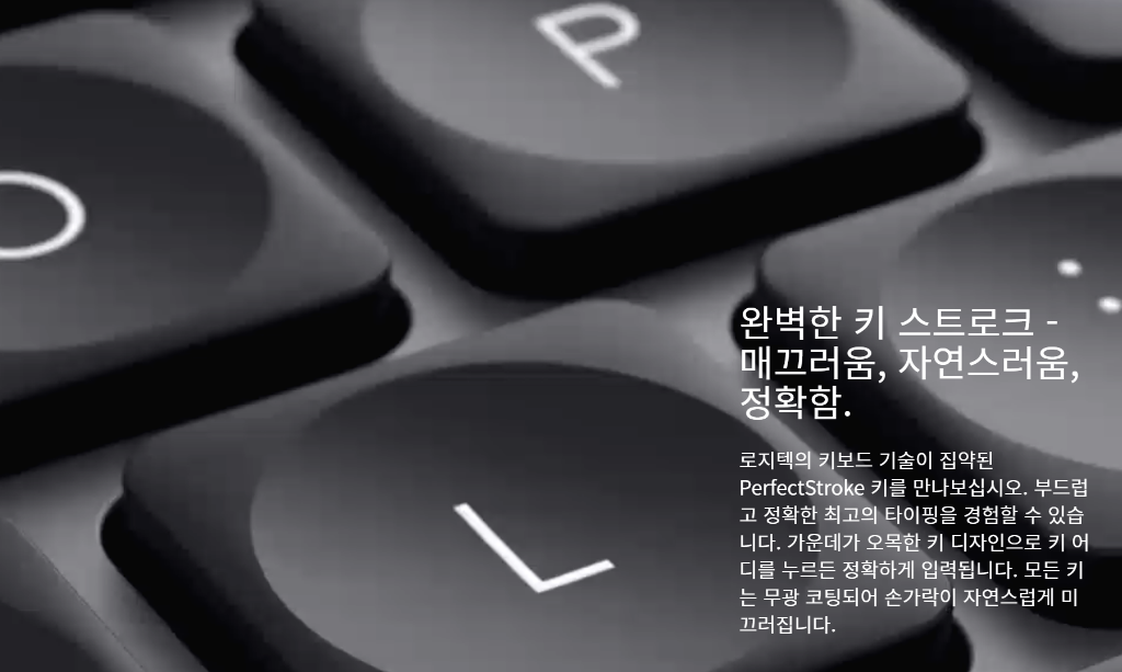로지텍의 키보드 기술이 집약된 PerfectStroke 키를 만나보십시오. 부드럽고 정확한 최고의 타이핑을 경험할 수 있습니다. 가운데가 오목한 키 디자인으로 키 어디를 누르든 정확하게 입력됩니다. 모든 키는 무광 코팅되어 손가락이 자연스럽게 미끄러집니다.