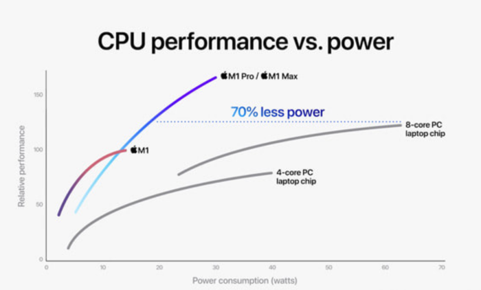 Apple의 M1 칩은 이미 다른 PC 칩에 비해 더 적은 전력을 사용하면서 좋은 성능을 달성할 수 있었지만 성능 면에서는 최신 8코어 PC 랩톱 칩에 의해 여전히 능가했습니다(그러나 에너지 효율성은 아님). 새로운 M1 Pro 및 M1 Max는 전력 소비와 성능 면에서 8코어 PC 랩톱 칩을 완전히 날려버렸습니다. 새로운 칩은 70% 더 적은 전력을 사용하므로 새로운 MacBook Pro의 배터리는 다른 컴퓨터에 비해 더 오래 지속됩니다.