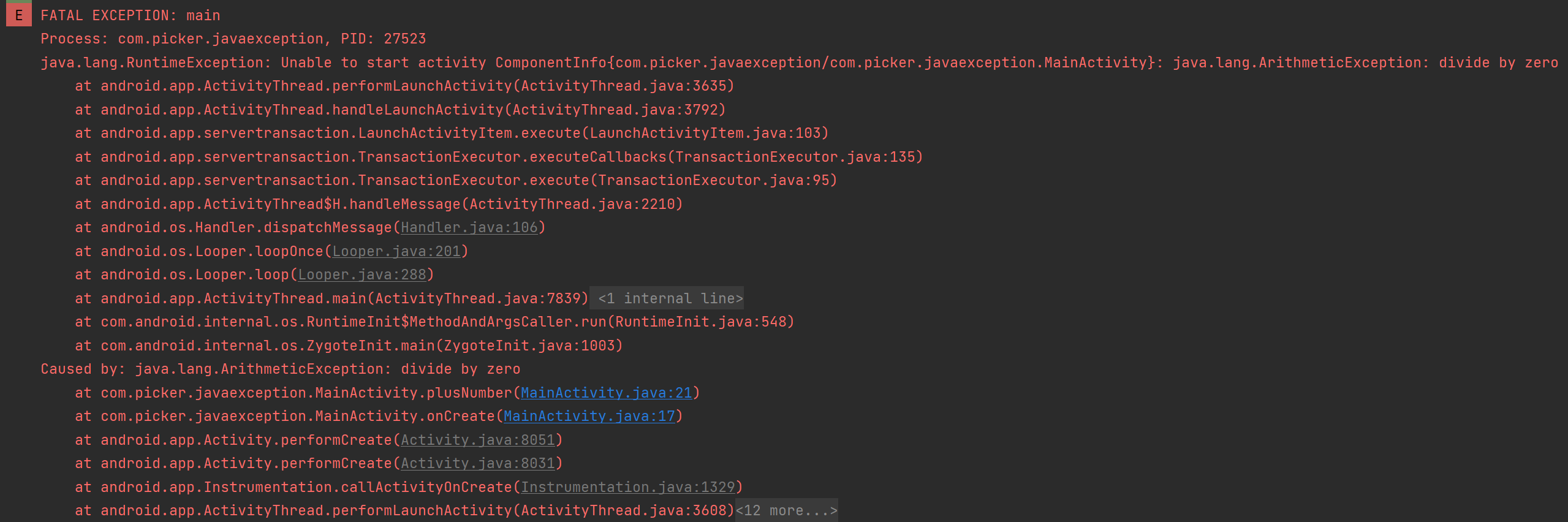 | FATAL EXCEPTION: main Process: com.picker.javaexception, PID: 27523 java.lang.RuntimeException: Unable to start activity ComponentInfo{com.picker.javaexception/com.picker.javaexception.MainActivity}: java.lang.ArithmeticException: divide by zero at android.app.ActivityThread.performLaunchActivity(ActivityThread.java:3635) at android.app.ActivityThread.handleLaunchActivity(ActivityThread.java:3792) at android.app.servertransaction.LaunchActivityItem.execute(LaunchActivityItem.java:103) at android.app.servertransaction.TransactionExecutor.executeCallbacks(TransactionExecutor.java:135) at android.app.servertransaction.TransactionExecutor.execute(TransactionExecutor.java:95) at android.app.ActivityThread$H.handleMessage(ActivityThread.java:2210) at android.os.Handler.dispatchMessage(Handler.java:106) at android.os.Looper.loopOnce(Looper.java:201) at android.os.Looper.loop(Looper.java:288) at android.app.ActivityThread.main(ActivityThread.java:7839) at java.lang.reflect.Method.invoke(Native Method) at co m.android.internal.os.RuntimeInit$MethodAndArgsCaller.run(RuntimeInit.java:548) at co m.android.internal.os.ZygoteInit.main(ZygoteInit.java:1003) Caused by: java.lang.ArithmeticException: divide by zero at com.picker.javaexception.MainActivity.plusNumber(MainActivity.java:21) at com.picker.javaexception.MainActivity.onCreate(MainActivity.java:17) at android.app.Activity.performCreate(Activity.java:8051) at android.app.Activity.performCreate(Activity.java:8031) at android.app.Instrumentation.callActivityOnCreate(Instrumentation.java:1329) at android.app.ActivityThread.performLaunchActivity(ActivityThread.java:3608) at android.app.ActivityThread.handleLaunchActivity(ActivityThread.java:3792) at android.app.servertransaction.LaunchActivityItem.execute(LaunchActivityItem.java:103) at android.app.servertransaction.TransactionExecutor.executeCallbacks(TransactionExecutor.java:135) at android.app.servertransaction.TransactionExecutor.execute(TransactionExecutor.java:95) at android.app.ActivityThread$H.handleMessage(ActivityThread.java:2210) at android.os.Handler.dispatchMessage(Handler.java:106) at android.os.Looper.loopOnce(Looper.java:201) at android.os.Looper.loop(Looper.java:288) at android.app.ActivityThread.main(ActivityThread.java:7839) at java.lang.reflect.Method.invoke(Native Method) at co m.android.internal.os.RuntimeInit$MethodAndArgsCaller.run(RuntimeInit.java:548) at co m.android.internal.os.ZygoteInit.main(ZygoteInit.java:1003) |