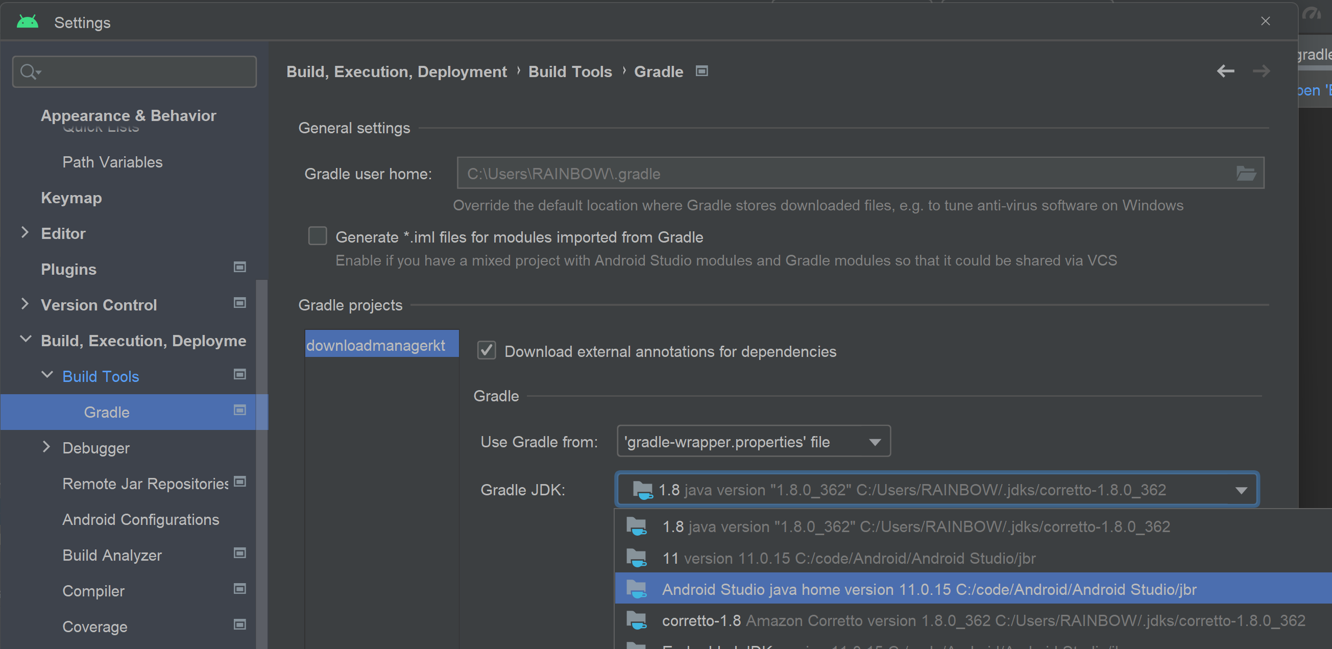 Gradle JDK 리스트에서 android studio java home version을 선택합니다.