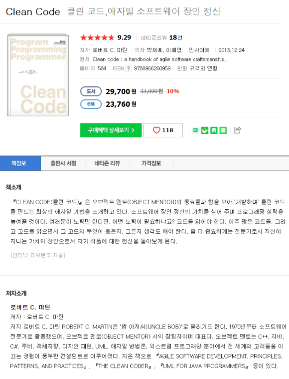 CLEAN CODE는 OBJECT MENTOR 동료들과 '개발'하여 클린 코드를 만들기 위한 최고의 애자일 기법을 소개합니다. 소프트웨어 장인 정신의 가치를 심어주고 프로그래밍 기술을 향상시킵니다. 당신이 시도한다면 어떤 노력이 필요합니까? 코드를 읽어야 합니다. 많은 코드. 그리고 코드를 읽으면서 그 코드에서 무엇이 옳고 그른지 생각해야 합니다. 더 중요한 것은 전문가로서의 가치와 장인으로서의 일에 대한 헌신을 되돌아보는 것입니다.
