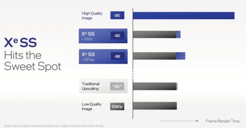 첫 번째는 내년 1분기에 출시될 Alchemist입니다. 새로운 아키텍처와 함께하기 위해 Intel은 AMD의 FidelityFX Super Resolution 및 NVIDIA의 Deep Learning Super Sampling에 필적하는 XeSS 슈퍼샘플링 기술과 같은 수용 가능한 소프트웨어 스택 및 기능을 제공하는 데 중점을 두고 있습니다.