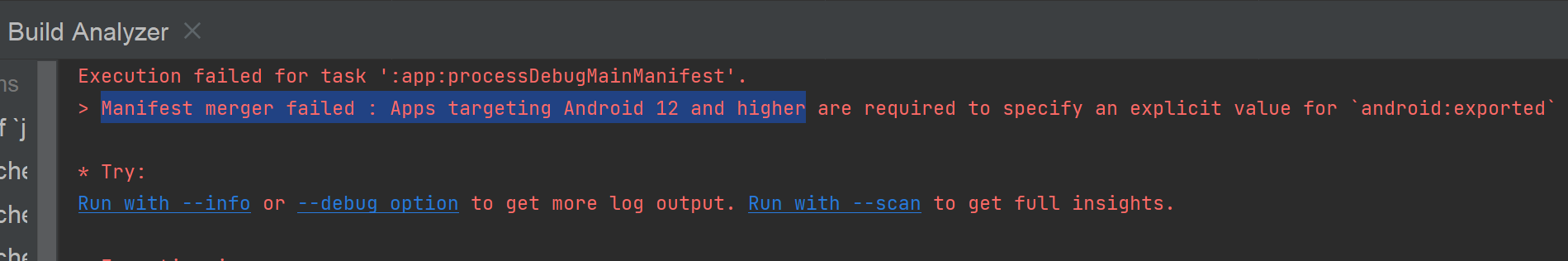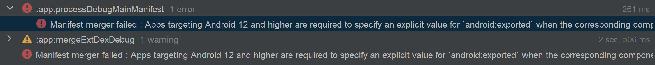 Manifest merger failed : Apps targeting Android 12 and higher are required to specify an explicit value for `android:exported` when the corresponding component has an intent filter defined. See https://developer.android.com/guide/topics/manifest/activity-element#exported for details.