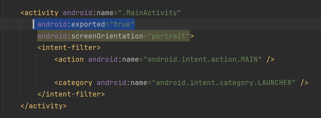 AndroidManifest.xml파일을 열어주고 아래 스크린샷의 파란색 하이라이트 처럼 exported를 true로 설정합니다.