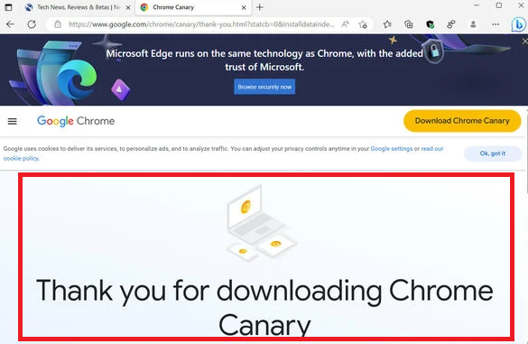 다운로드하고 설치하려는 시도(둘 다 실험용 브라우저 빌드)로 인해 Edge 브라우저 창에
