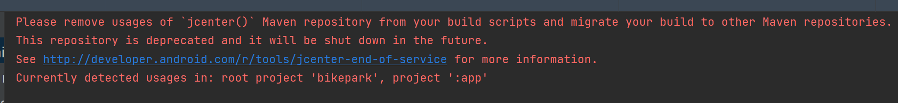 Please remove usages of `jcenter()` Maven repository from your build scripts and migrate your build to other Maven repositories.