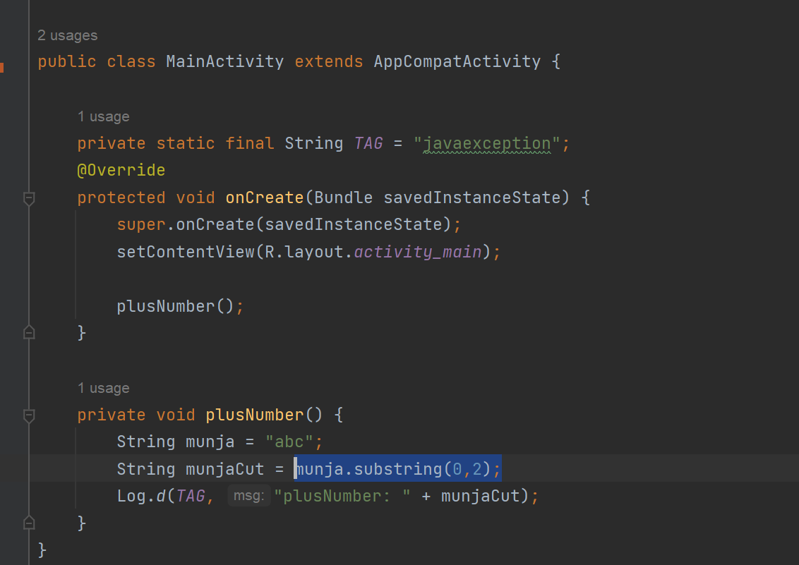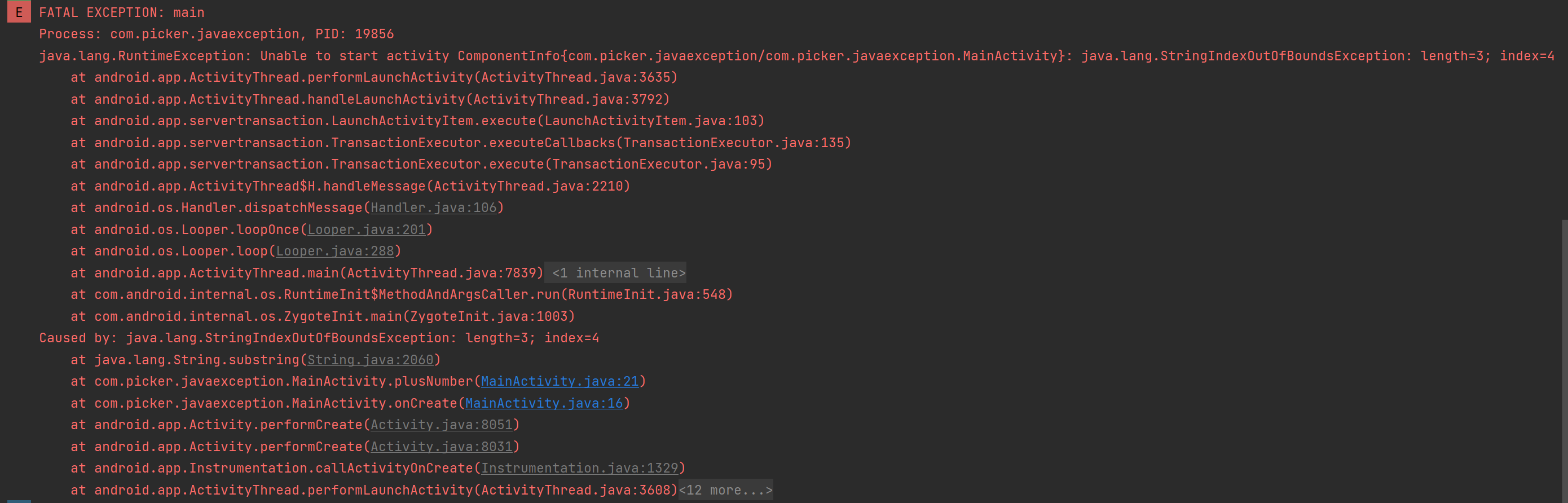 | FATAL EXCEPTION: main Process: com.picker.javaexception, PID: 19856 java.lang.RuntimeException: Unable to start activity ComponentInfo{com.picker.javaexception/com.picker.javaexception.MainActivity}: java.lang.StringIndexOutOfBoundsException: length=3; index=4 at android.app.ActivityThread.performLaunchActivity(ActivityThread.java:3635) at android.app.ActivityThread.handleLaunchActivity(ActivityThread.java:3792) at android.app.servertransaction.LaunchActivityItem.execute(LaunchActivityItem.java:103) at android.app.servertransaction.TransactionExecutor.executeCallbacks(TransactionExecutor.java:135) at android.app.servertransaction.TransactionExecutor.execute(TransactionExecutor.java:95) at android.app.ActivityThread$H.handleMessage(ActivityThread.java:2210) at android.os.Handler.dispatchMessage(Handler.java:106) at android.os.Looper.loopOnce(Looper.java:201) at android.os.Looper.loop(Looper.java:288) at android.app.ActivityThread.main(ActivityThread.java:7839) at java.lang.reflect.Method.invoke(Native Method) at co m.android.internal.os.RuntimeInit$MethodAndArgsCaller.run(RuntimeInit.java:548) at co m.android.internal.os.ZygoteInit.main(ZygoteInit.java:1003) Caused by: java.lang.StringIndexOutOfBoundsException: length=3; index=4 at java.lang.String.substring(String.java:2060) at com.picker.javaexception.MainActivity.plusNumber(MainActivity.java:21) at com.picker.javaexception.MainActivity.onCreate(MainActivity.java:16) at android.app.Activity.performCreate(Activity.java:8051) at android.app.Activity.performCreate(Activity.java:8031) at android.app.Instrumentation.callActivityOnCreate(Instrumentation.java:1329) at android.app.ActivityThread.performLaunchActivity(ActivityThread.java:3608) at android.app.ActivityThread.handleLaunchActivity(ActivityThread.java:3792) at android.app.servertransaction.LaunchActivityItem.execute(LaunchActivityItem.java:103) at android.app.servertransaction.TransactionExecutor.executeCallbacks(TransactionExecutor.java:135) at android.app.servertransaction.TransactionExecutor.execute(TransactionExecutor.java:95) at android.app.ActivityThread$H.handleMessage(ActivityThread.java:2210) at android.os.Handler.dispatchMessage(Handler.java:106) at android.os.Looper.loopOnce(Looper.java:201) at android.os.Looper.loop(Looper.java:288) at android.app.ActivityThread.main(ActivityThread.java:7839) at java.lang.reflect.Method.invoke(Native Method) at co m.android.internal.os.RuntimeInit$MethodAndArgsCaller.run(RuntimeInit.java:548) at co m.android.internal.os.ZygoteInit.main(ZygoteInit.java:1003) |