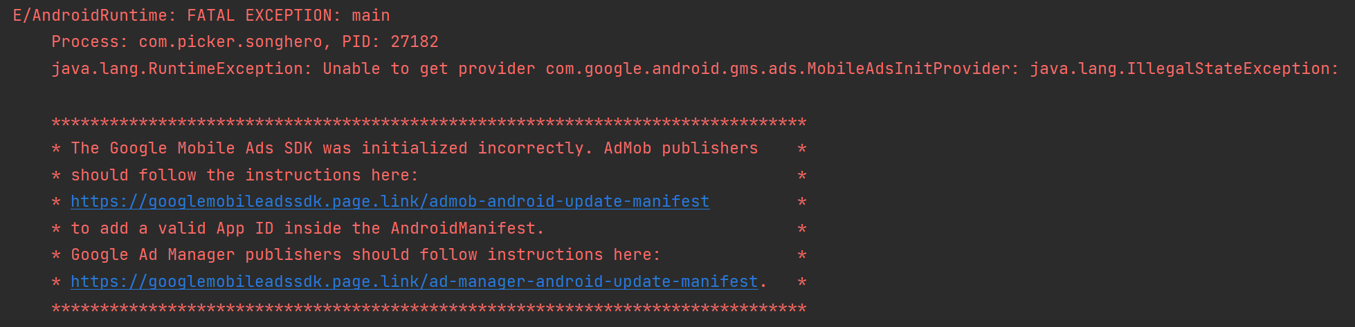 java.lang.RuntimeException: Unable to get provider com.google.android.gms.ads.MobileAdsInitProvider: java.lang.IllegalStateException: