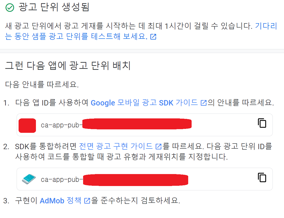 아래 admob에 들어가면 나오는 광고단위이며, 1번항목이 application id입니다. (ca~~~~~)