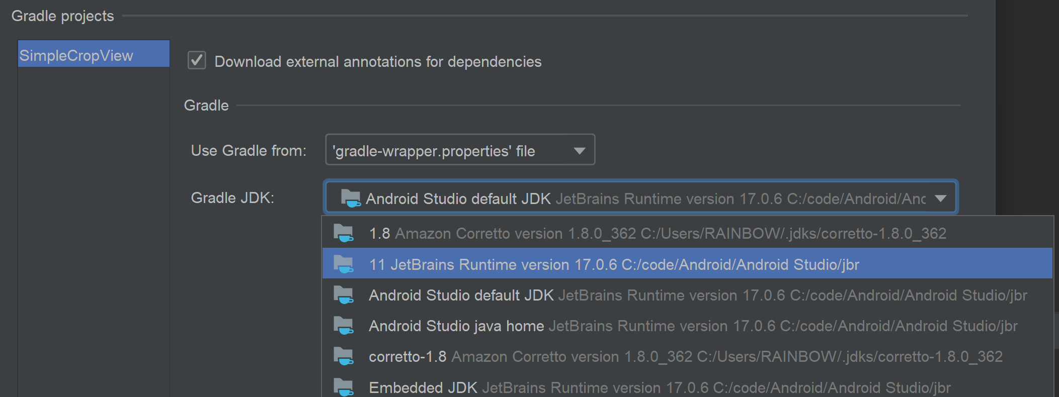 이 메뉴에 들어가면 Gradle JDK 버전을 선택하는 리스트가 있습니다.