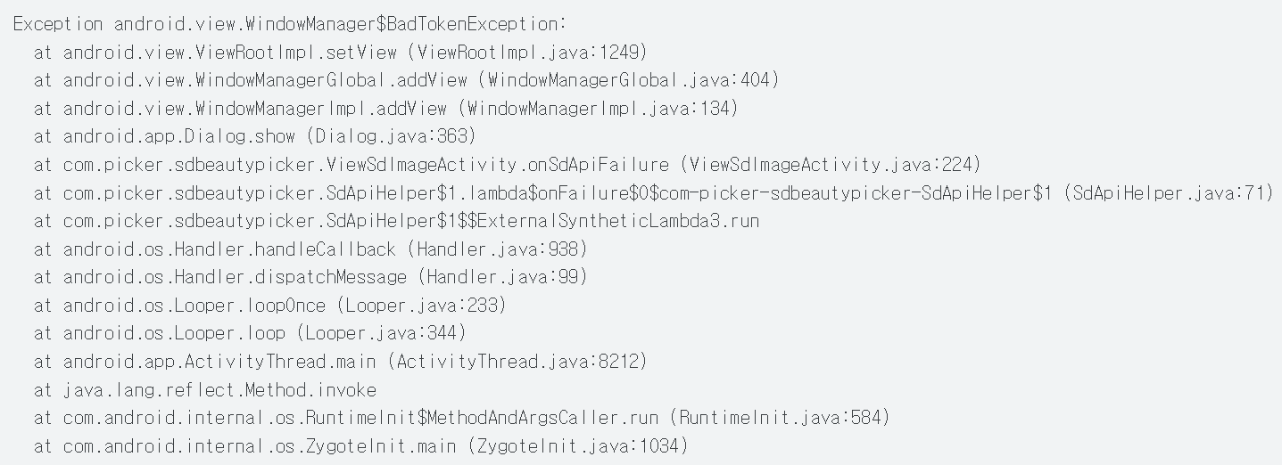 | Exception android.view.WindowManager$BadTokenException: at android.view.ViewRootImpl.setView (ViewRootImpl.java:1249) at android.view.WindowManagerGlobal.addView (WindowManagerGlobal.java:404) at android.view.WindowManagerImpl.addView (WindowManagerImpl.java:134) at android.app.Dialog.show (Dialog.java:363) at com.picker.sdbeautypicker.ViewSdImageActivity.onSdApiFailure (ViewSdImageActivity.java:224) at com.picker.sdbeautypicker.SdApiHelper$1.lambda$onFailure$0$com-picker-sdbeautypicker-SdApiHelper$1 (SdApiHelper.java:71) at com.picker.sdbeautypicker.SdApiHelper$1$$ExternalSyntheticLambda3.run at android.os.Handler.handleCallback (Handler.java:938) at android.os.Handler.dispatchMessage (Handler.java:99) at android.os.Looper.loopOnce (Looper.java:233) at android.os.Looper.loop (Looper.java:344) at android.app.ActivityThread.main (ActivityThread.java:8212) at java.lang.reflect.Method.invoke at co m.android.internal.os.RuntimeInit$MethodAndArgsCaller.run (RuntimeInit.java:584) at com.android.internal.os.ZygoteInit.main (ZygoteInit.java:1034) |