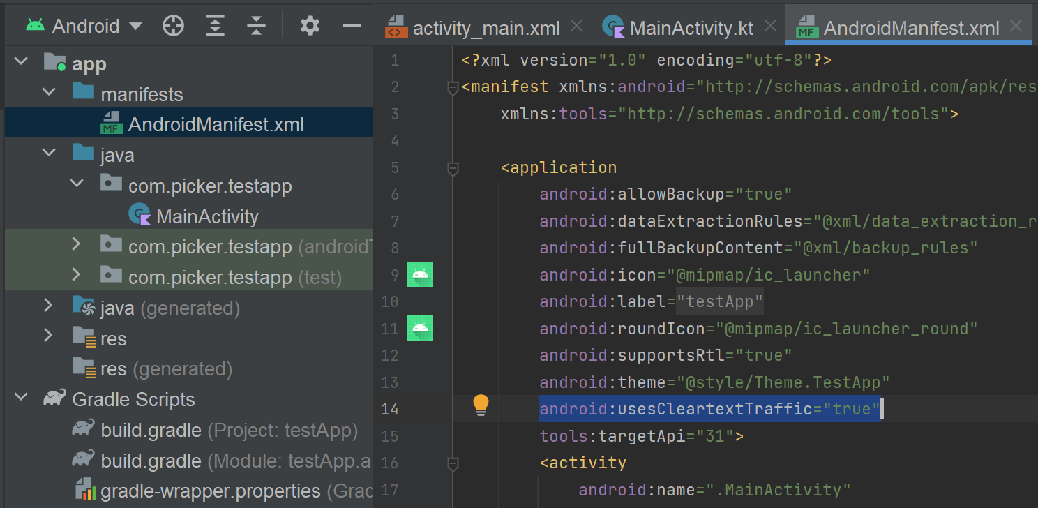 -. AndroidManifest.xml파일을 열어서 아래처럼 파란색 한 줄 추가하면 해결 된다.
