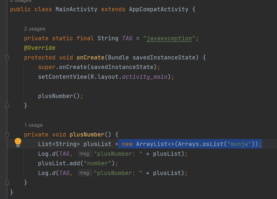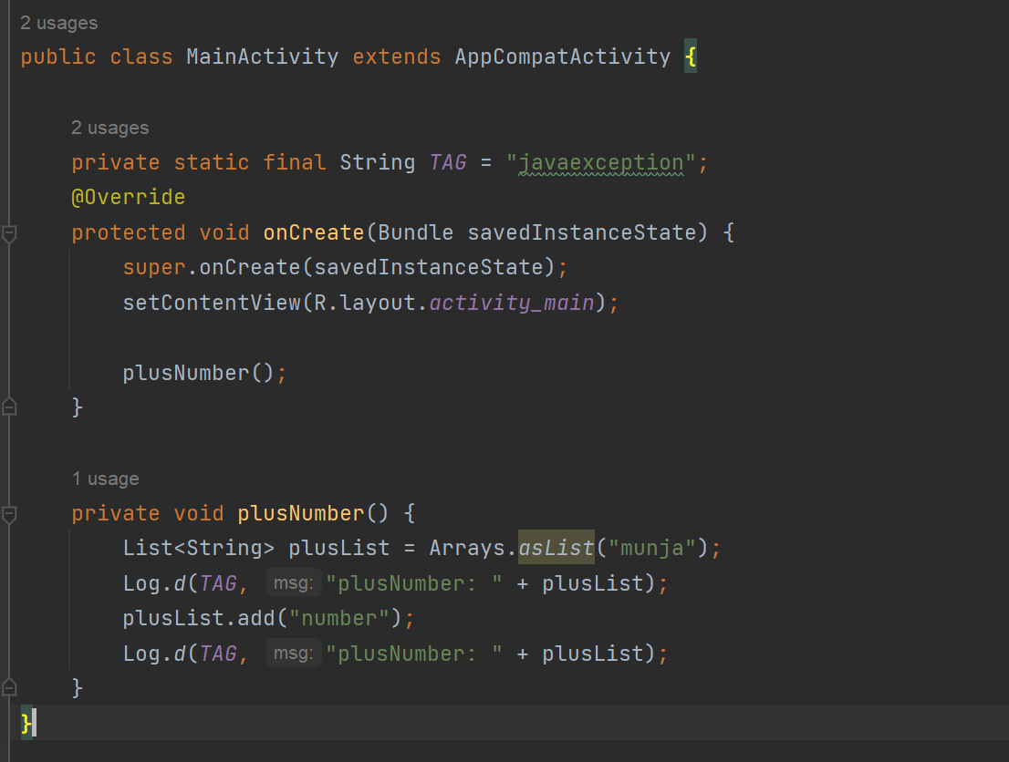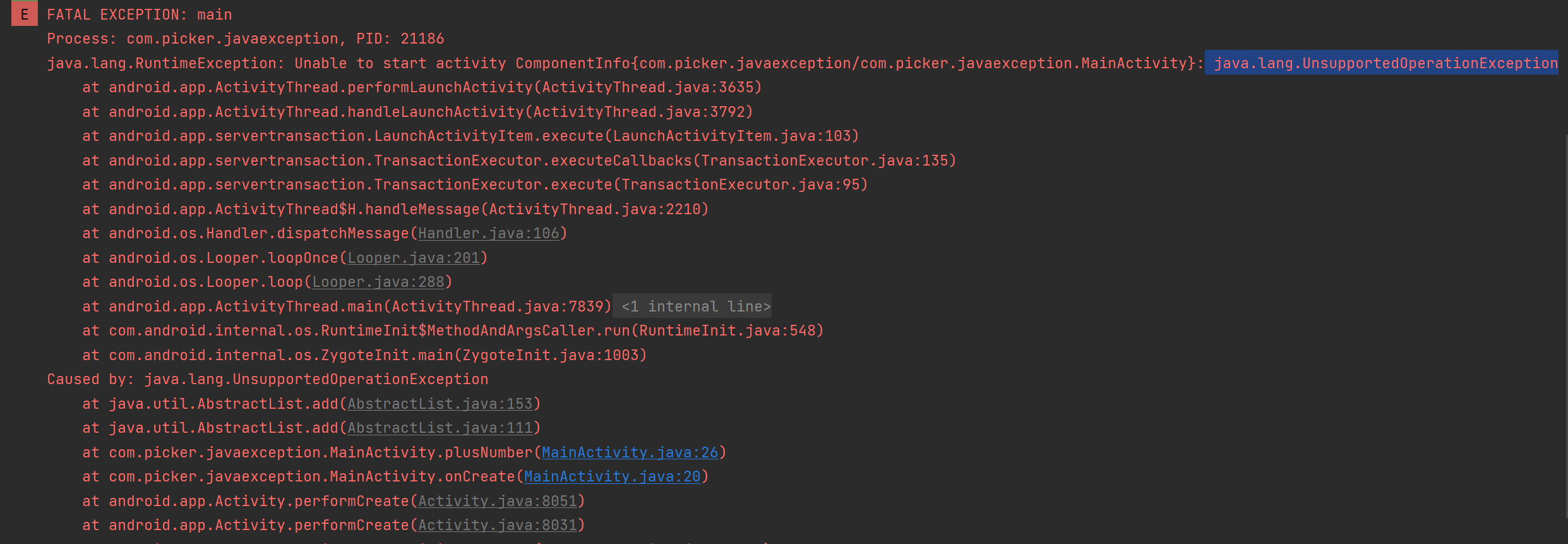 | FATAL EXCEPTION: main Process: com.picker.javaexception, PID: 21186 java.lang.RuntimeException: Unable to start activity ComponentInfo{com.picker.javaexception/com.picker.javaexception.MainActivity}: java.lang.UnsupportedOperationException at android.app.ActivityThread.performLaunchActivity(ActivityThread.java:3635) at android.app.ActivityThread.handleLaunchActivity(ActivityThread.java:3792) at android.app.servertransaction.LaunchActivityItem.execute(LaunchActivityItem.java:103) at android.app.servertransaction.TransactionExecutor.executeCallbacks(TransactionExecutor.java:135) at android.app.servertransaction.TransactionExecutor.execute(TransactionExecutor.java:95) at android.app.ActivityThread$H.handleMessage(ActivityThread.java:2210) at android.os.Handler.dispatchMessage(Handler.java:106) at android.os.Looper.loopOnce(Looper.java:201) at android.os.Looper.loop(Looper.java:288) at android.app.ActivityThread.main(ActivityThread.java:7839) at java.lang.reflect.Method.invoke(Native Method) at co m.android.internal.os.RuntimeInit$MethodAndArgsCaller.run(RuntimeInit.java:548) at co m.android.internal.os.ZygoteInit.main(ZygoteInit.java:1003) Caused by: java.lang.UnsupportedOperationException at java.util.AbstractList.add(AbstractList.java:153) at java.util.AbstractList.add(AbstractList.java:111) at com.picker.javaexception.MainActivity.plusNumber(MainActivity.java:26) at com.picker.javaexception.MainActivity.onCreate(MainActivity.java:20) at android.app.Activity.performCreate(Activity.java:8051) at android.app.Activity.performCreate(Activity.java:8031) at android.app.Instrumentation.callActivityOnCreate(Instrumentation.java:1329) at android.app.ActivityThread.performLaunchActivity(ActivityThread.java:3608) at android.app.ActivityThread.handleLaunchActivity(ActivityThread.java:3792) at android.app.servertransaction.LaunchActivityItem.execute(LaunchActivityItem.java:103) at android.app.servertransaction.TransactionExecutor.executeCallbacks(TransactionExecutor.java:135) at android.app.servertransaction.TransactionExecutor.execute(TransactionExecutor.java:95) at android.app.ActivityThread$H.handleMessage(ActivityThread.java:2210) at android.os.Handler.dispatchMessage(Handler.java:106) at android.os.Looper.loopOnce(Looper.java:201) at android.os.Looper.loop(Looper.java:288) at android.app.ActivityThread.main(ActivityThread.java:7839) at java.lang.reflect.Method.invoke(Native Method) at co m.android.internal.os.RuntimeInit$MethodAndArgsCaller.run(RuntimeInit.java:548) at co m.android.internal.os.ZygoteInit.main(ZygoteInit.java:1003) |